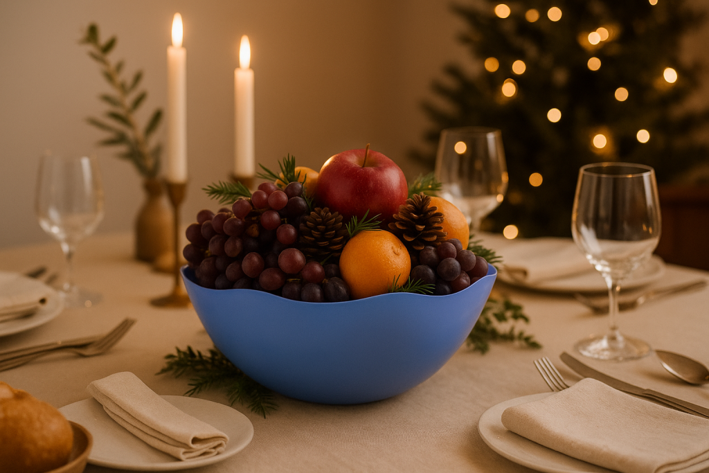 Potes transparentes podem virar luminárias com pisca-pisca, bacias podem se transformar em centros de mesa com frutas ou pinhas, e bandejas reutilizáveis podem receber doces, velas ou pequenos arranjos.